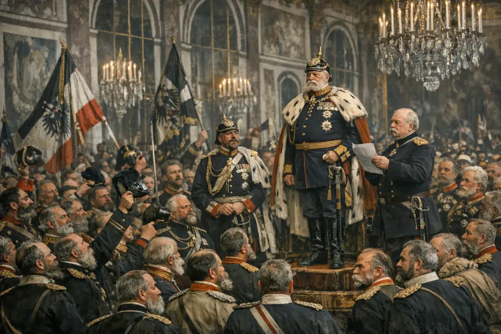 Le 18 janvier 1871, au cœur de la guerre franco-prussienne, Guillaume 1er de Prusse est proclamé empereur allemand dans la galerie des Glaces du château de Versailles. Ce lieu, choisi délibérément en territoire français occupé, symbolise l’humiliation de la France et la victoire prussienne. Sous l’impulsion du chancelier Otto von Bismarck, les princes et États allemands reconnaissent l’unification de l’Allemagne autour de la Prusse. Cet acte fonde le Deuxième Reich, consacrant l’unité politique allemande et l’émergence d’une nouvelle grande puissance européenne, tout en annonçant un profond bouleversement de l’équilibre politique du continent.